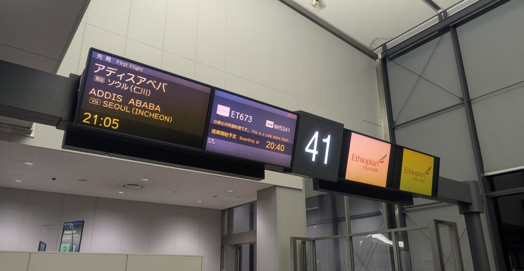 搭乗ゲートにはアディスアベバ行きの表示があって少し不安でしたが、仁川経由アディスアベバ行きの、仁川までの区間だけ搭乗する形だったようです。ちなみに、搭乗者はほとんどが黒人の方々でした。エチオピアに帰国されるところなのでしょうか。
