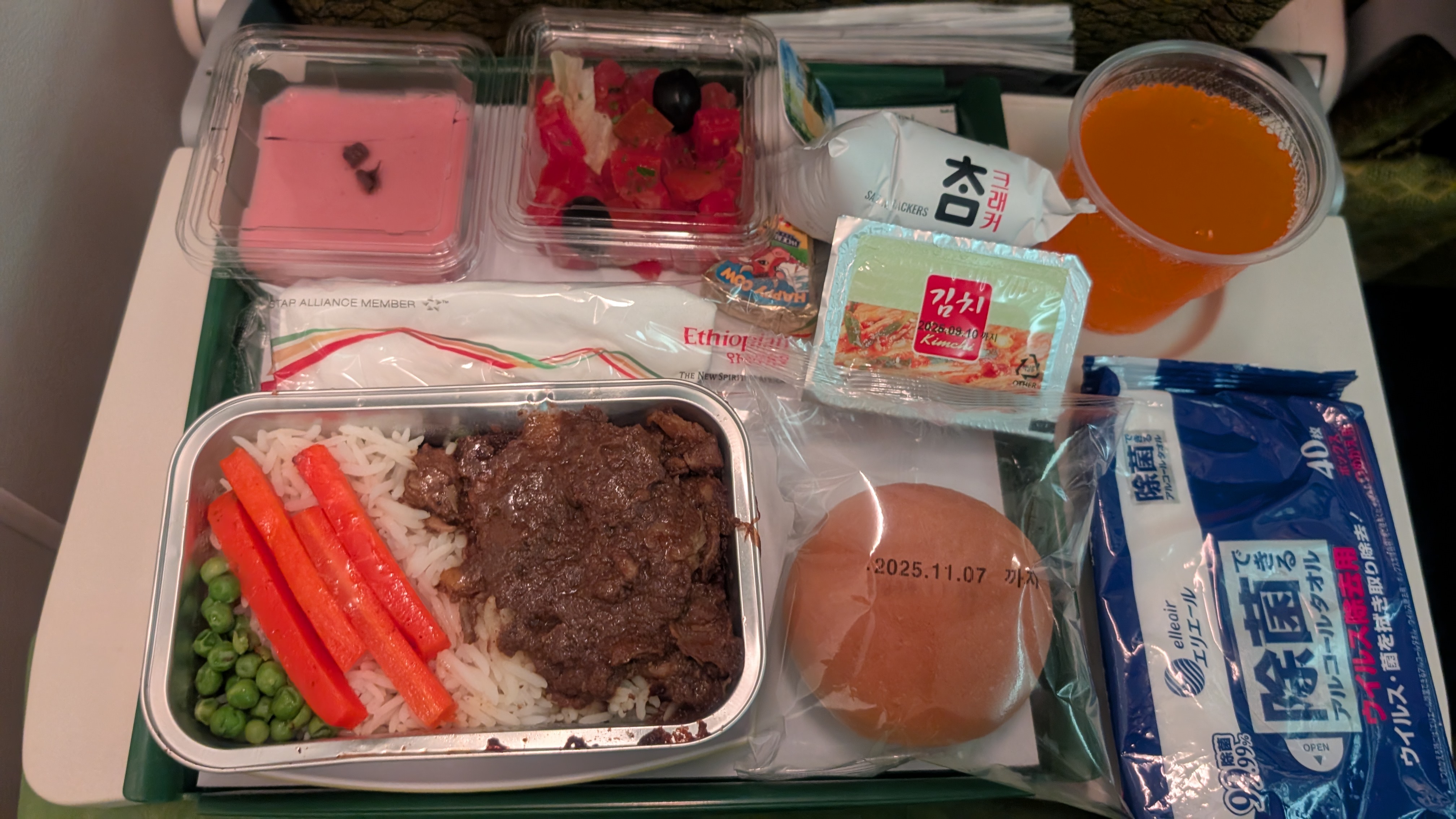 機内食はこんな感じです。"Beef or Chicken?"に対し"Beef please."と言ったのですが、味が明らかにラム肉だったような…。全部美味しくいただきました。