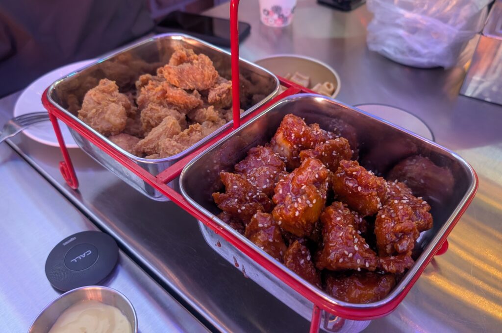昼食は弘大のBBQチキン。骨なしチキンを2種類の味で注文しましたが、結構な量でした。これは、韓国の飲食店は、「おひとり様」を受け入れる文化が薄いためかと思います。