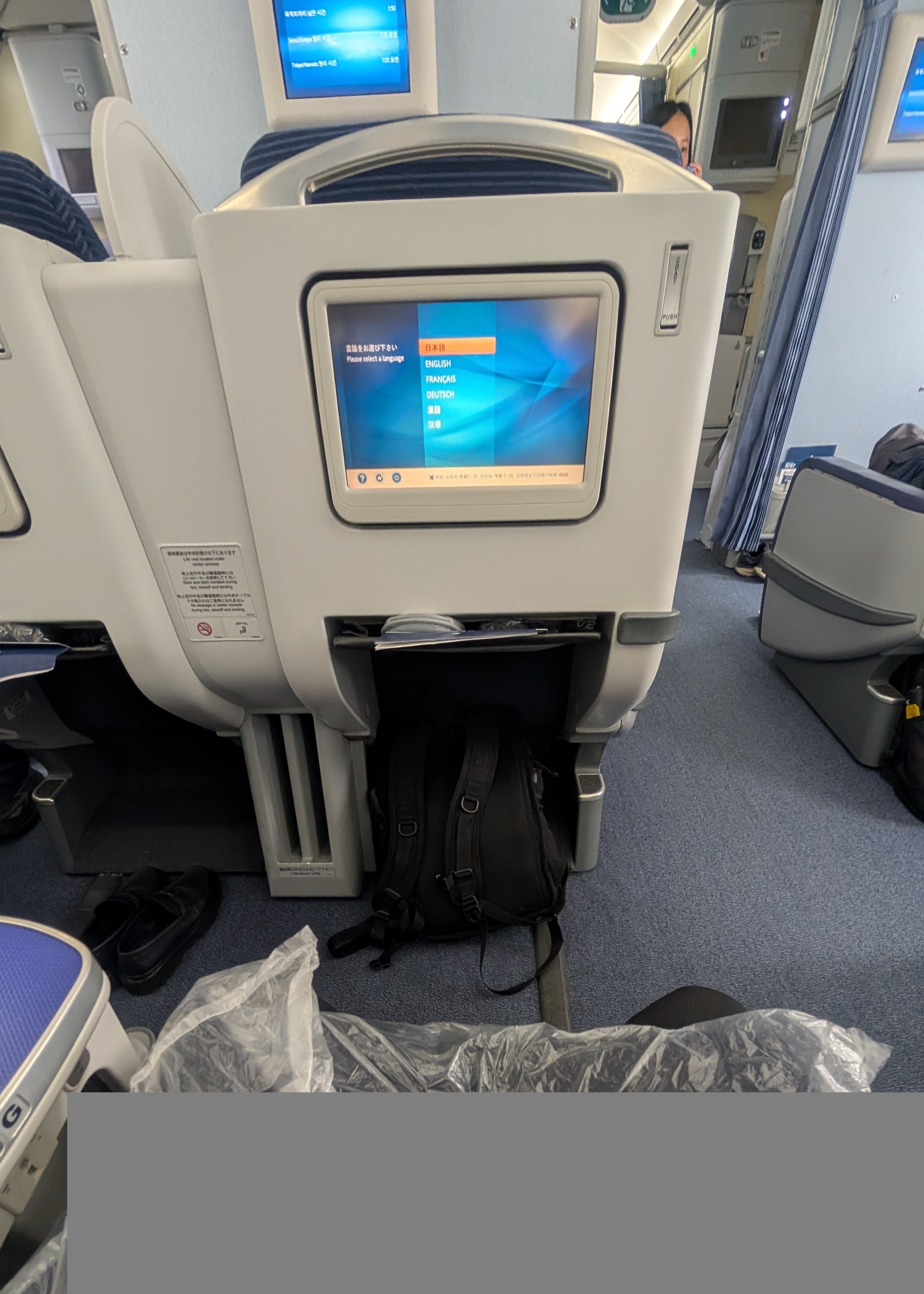 無事搭乗でき、初めてのビジネスクラス座席へ。荷物を前の座席下に置いていたのですが、そこは荷物置き場ではありませんでした(ここでビジネスクラス初心者がバレる)。。CAさんがご丁寧に荷物を荷棚に上げてくださいました。