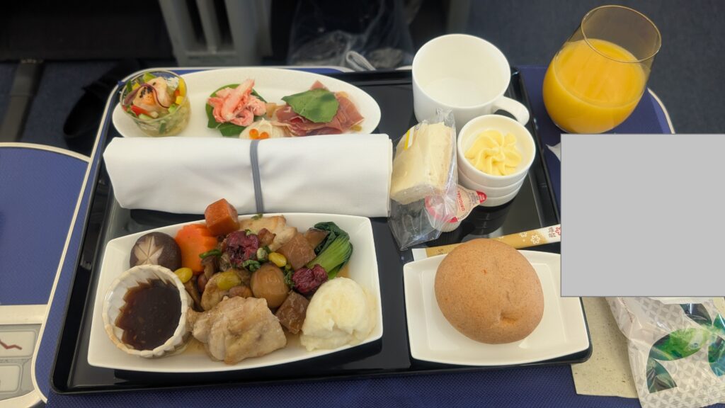 機内食はエコノミークラスに比べ、量はもちろん、質も高い。手が込んでおり、上品でした。